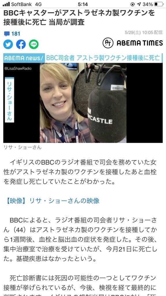 BBCによりますと、ラジオ番組の司会者、リサ・ショーさん(44)はアストラゼネカ製のワクチンを接種してから1週間後、血栓と脳出血の症状を発症しました。