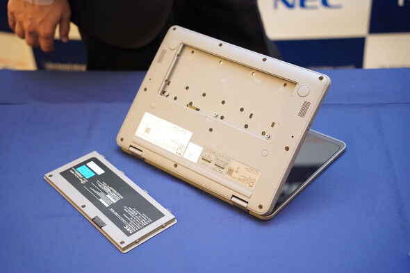 バッテリーは新たに底面から取り外せる着脱式となり、劣化などで交換する際の作業工数を削減している。バッテリーパック部分に限りトルクス(星型)ネジを採用することで、取り扱いに注意が必要なバッテリーを“分解好き”な児童/生徒が容易に取り外せないようにする工夫も施されている。